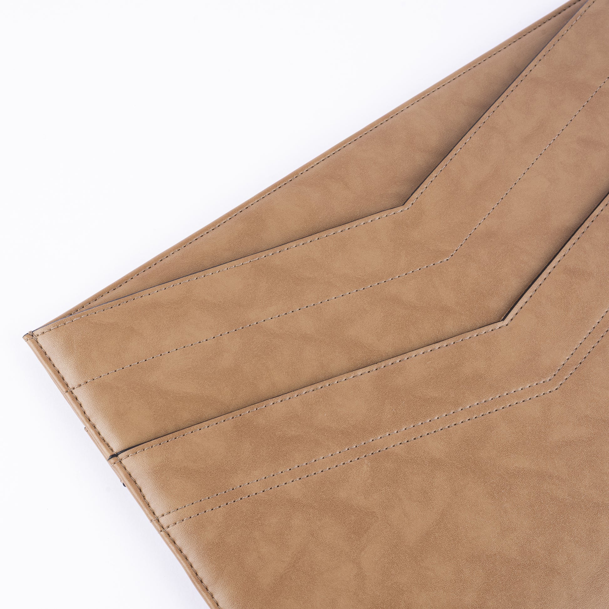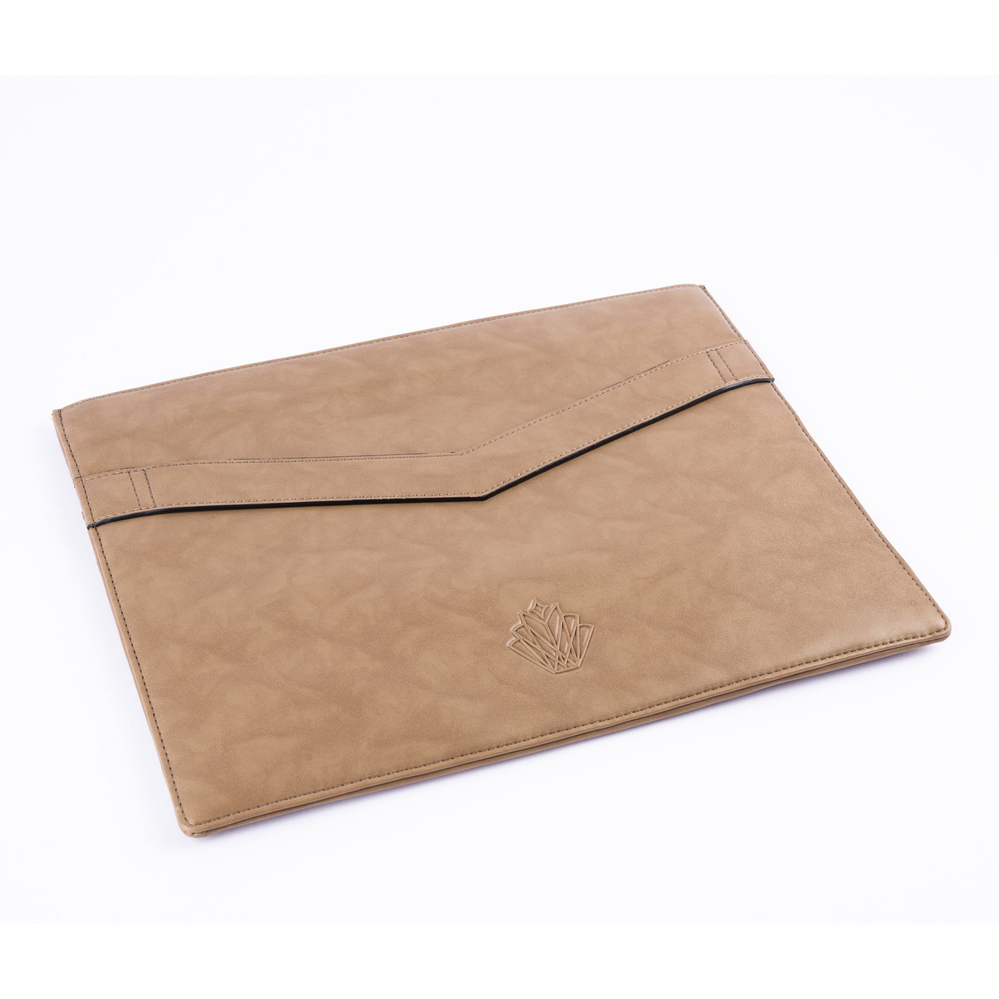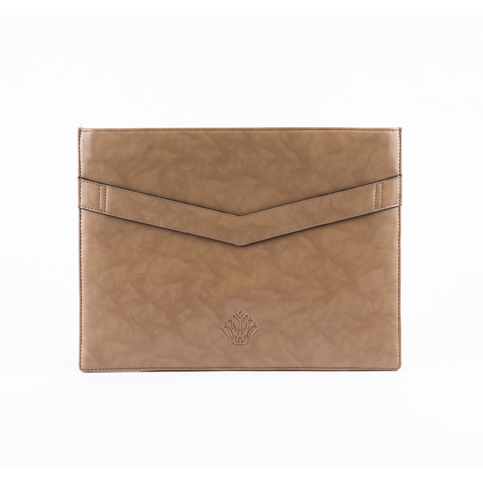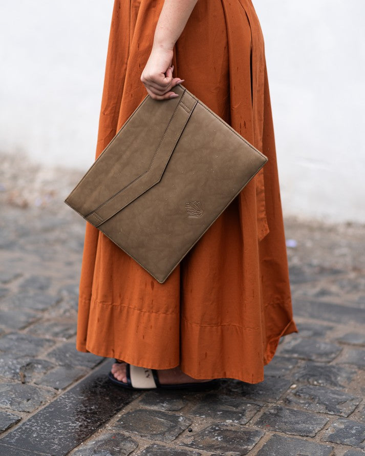 Naaz embodies quiet pride, offering protection for a 13 and 14-inch laptop in a form that is slender, refined, and practical. Its textured grain distinguishes it within the collection, while the magnetic closure preserves elegance in motion. The integrated hand strap transforms it into a carry piece, offering freedom from a larger bag in both professional and casual settings. Pride here is understated, dignity expressed through restraint and ease.